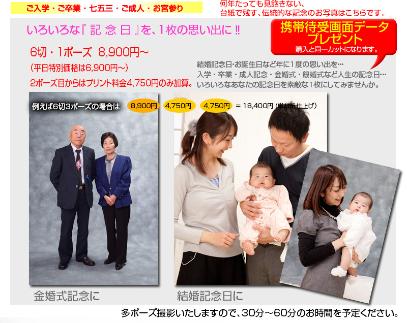 多ポーズ撮影いたしますので、30分〜のお時間をご予定くださいませ。